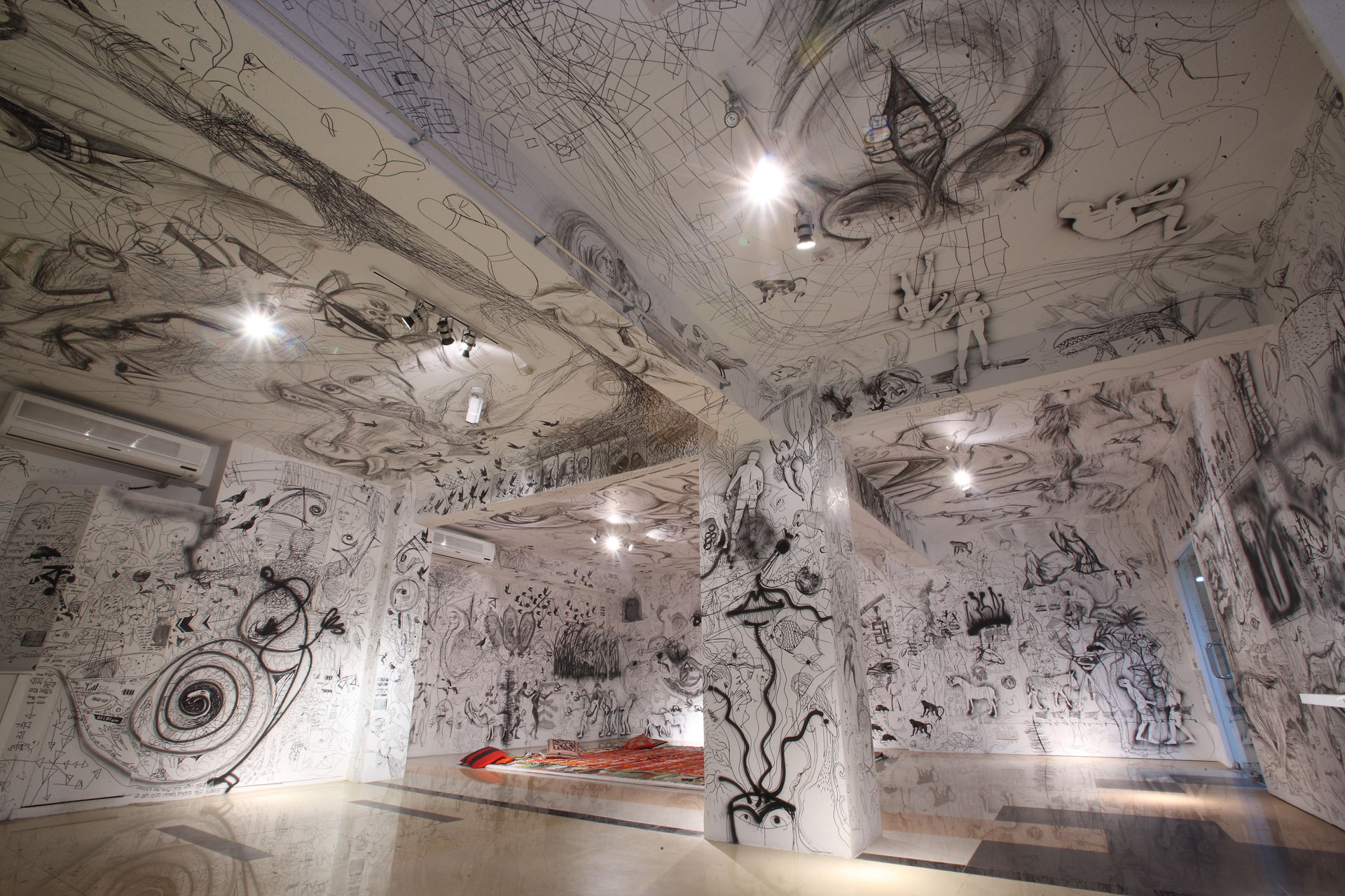 A two month long collective project was made as a part of our capacity building and audience Development. Britto members as well as few individuals drew on the walls and ceiling of Britto for a month. A day to day development, overlapping of drawings to ensure the collectivity rather than individuality by refusing the conventional idea of ownership of one’s art practice was the foremost thought behind this project. An ARTRELAX for the viewers providing a lovely large and colorful floor mat made by an artist, pillows on top, music and tea were the a part of the month long show in whole December. The exhibition was wrapped up by a social gathering on the last night of the year 2012.